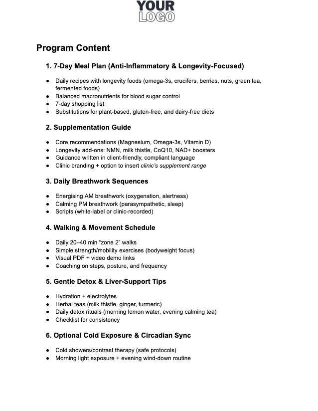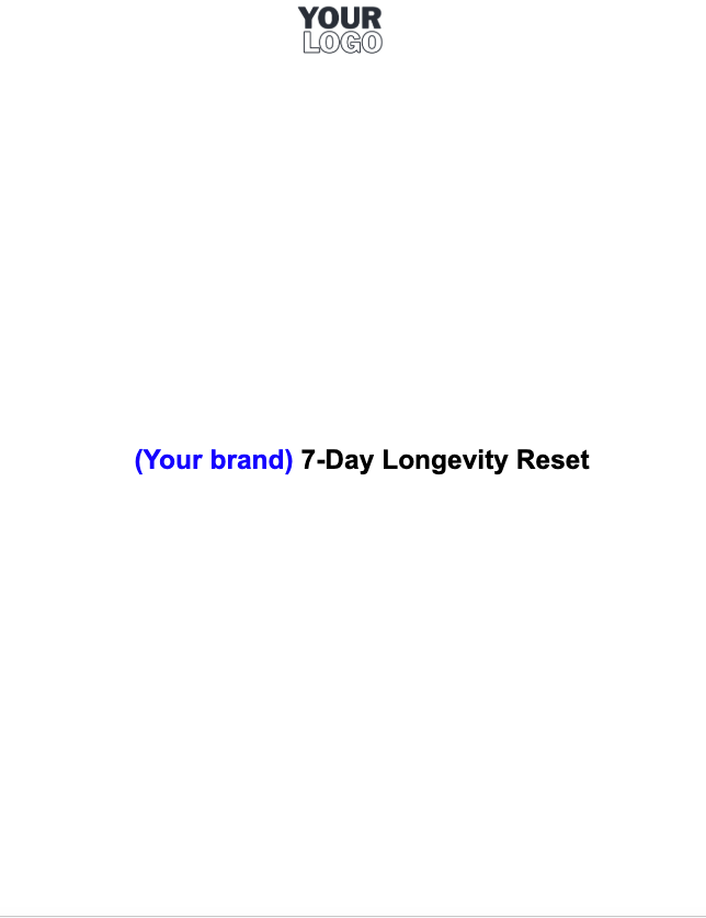 Give your clients a structured, science-backed reset designed to boost energy, lower inflammation, and kickstart healthy ageing. The 7-Day Longevity Reset is a ready-to-use, white-label wellness program that clinics, wellness centers, and practitioners can sell directly to their clients under their own brand.